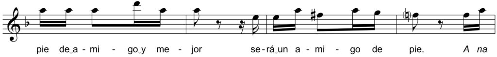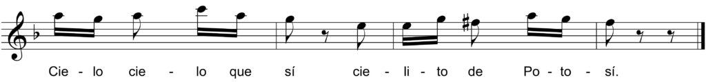 Creo que el acompañamiento del cielito, ya sea bajo la fórmula de arpegios o de vals, pudo haber sido el factor determinante en el proceso de identificación del cielito como ‘cielito’ por sus cultores, por lo menos en la primera mitad del siglo XIX. Mucho más determinante, de por sí, que el esquema melódico-rítmico tradicional con que se entonaban las coplas durante el baile. (El hecho de que Cordero describa la música del cielito ateniéndose exclusivamente a los acordes de su acompañamiento, tal como hemos visto, parece ir en apoyo de esta hipótesis).