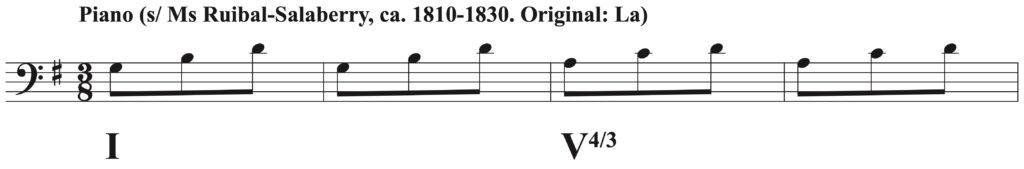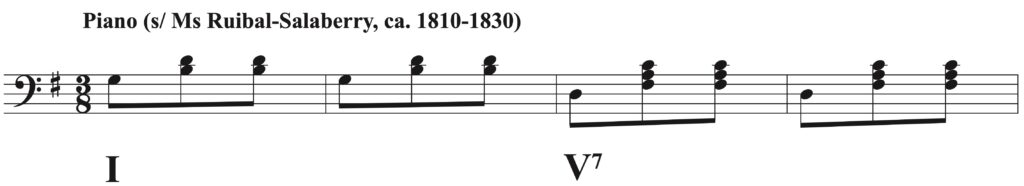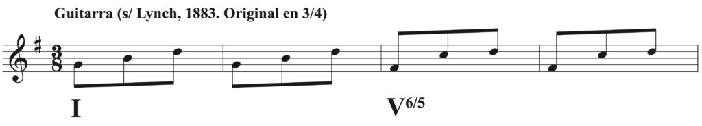 Los dos ejemplos restantes de la ilustración muestran el modelo de acompañamiento tal como aparece escrito en los cielitos para piano de la Colección Ruibal, fechables aproximadamente entre las décadas de 1810 y 1830 y que corresponden a la categoría de cielitos de danza sin canto (‘cantábile’ y ‘variado’, respectivamente; ver Mosca, 2020). En el primero se observa el mismo diseño guitarrístico de Lynch, llevado a la mano izquierda del piano (arpegios de tónica y de dominante en aire de tresillo, solamente difieren en la inversión empleada del acorde de dominante); el último nos muestra la misma fórmula en figuración de vals.